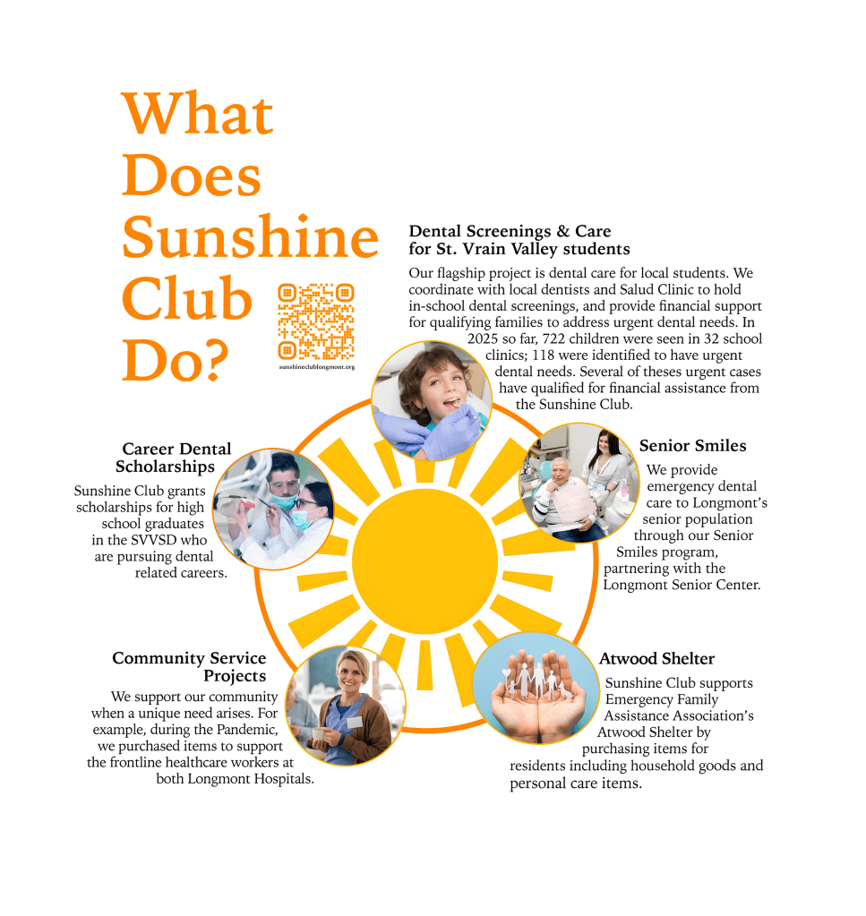 The Sunshine Club is a philanthropic organization supporting the St. Vrain Valley. Our primary areas of focus are: · Emergency dental health care for disadvantaged St. Vrain Valley school children · Providing a ray of Sunshine and cheer for community members · Dental Career Scholarships · And other charitable services as deemed appropriate by its members